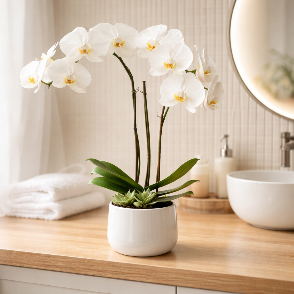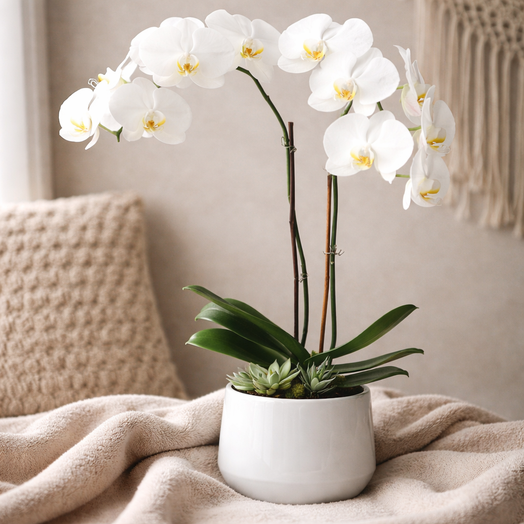 Ivory Whisper Orchid brings timeless elegance to any space. This delicate bloom features soft, creamy petals with subtle veining that catches the light beautifully. Perfect for adding a touch of sophistication to your home, office, or special events. The graceful form and gentle coloring make it an ideal choice for those seeking natural beauty and refined aesthetics. A stunning addition to floral arrangements or displayed alone as a statement piece.