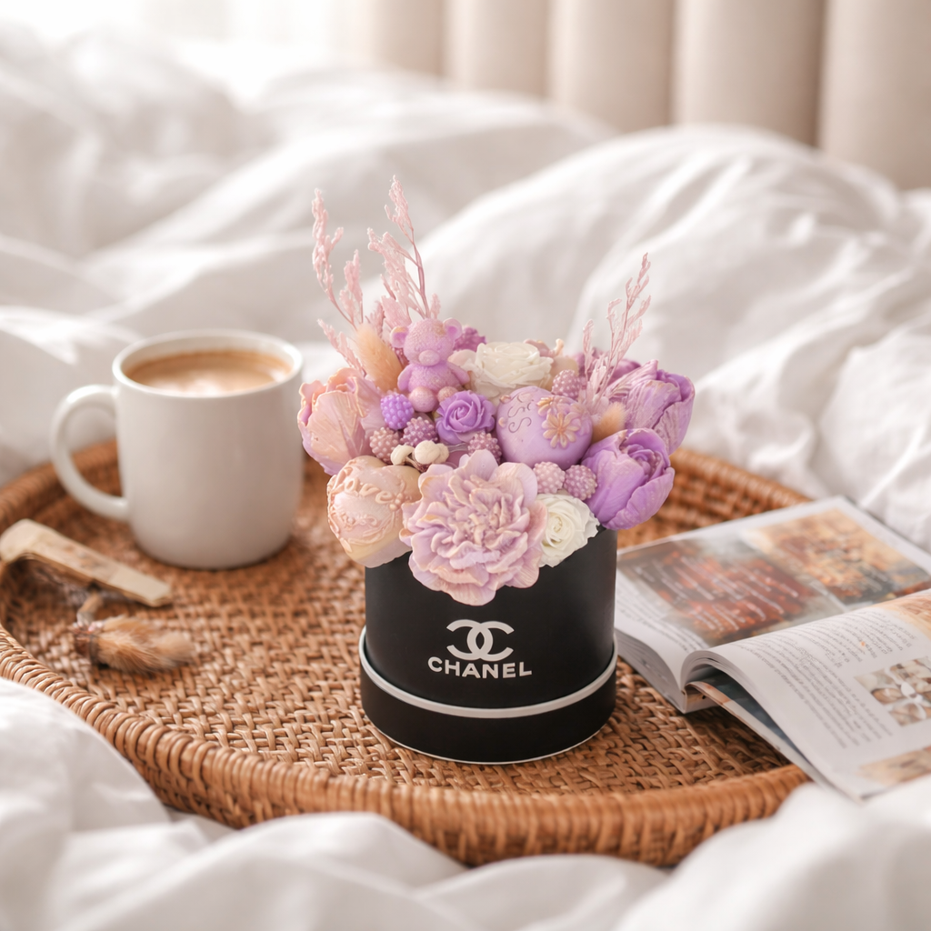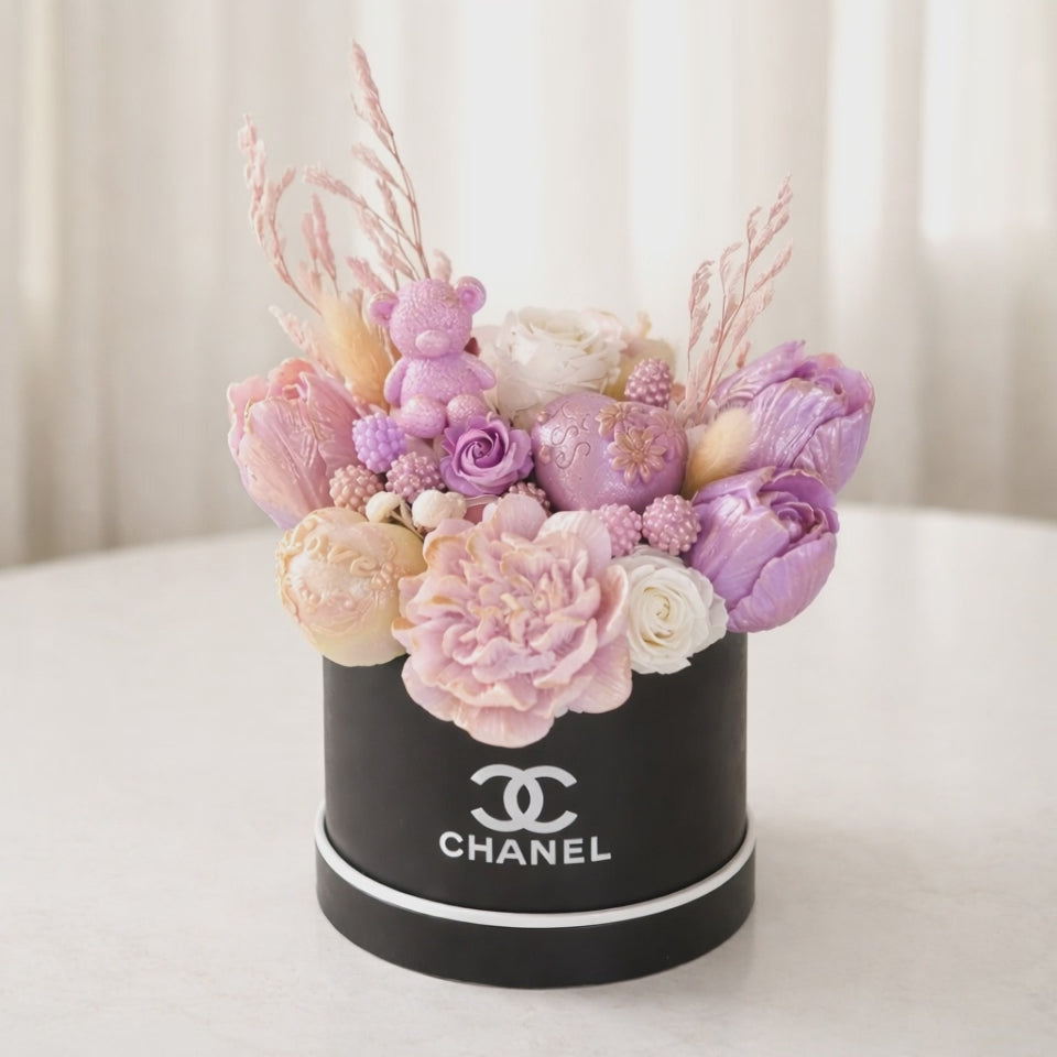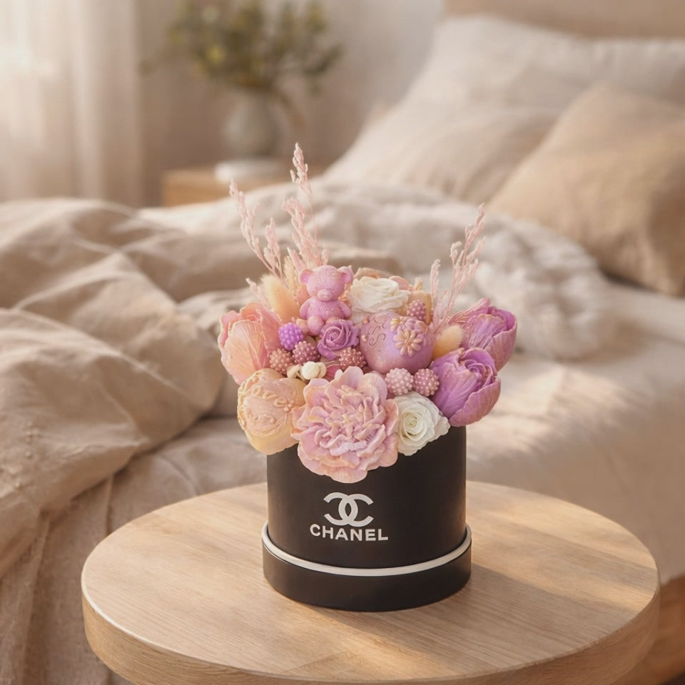 A delicate fusion of soft blush, lavender, and champagne hues, this handcrafted candle arrangement evokes quiet luxury and romantic charm. Featuring sculpted florals, a signature teddy accent, and subtle gold detailing, it’s designed to feel like a couture bouquet—elegant, feminine, and unforgettable. Perfect for gifting or elevating any refined space.